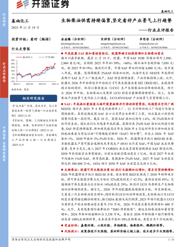 【开源证券】【202511】生物柴油供需持续偏紧,坚定看好产业景气上行趋势-4页 证券期货研究报告