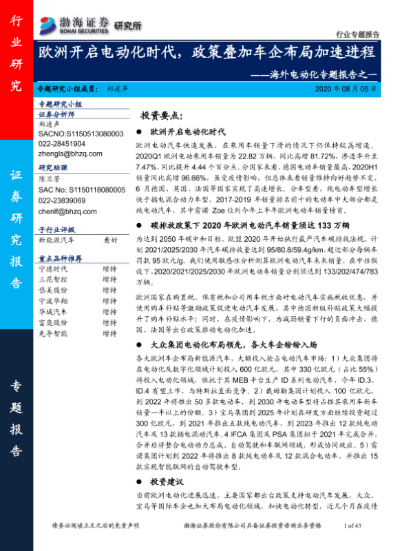 【渤海证券】【20200805】欧洲开启电动化时代,政策叠加车企布局加速进程-43页 行业研究