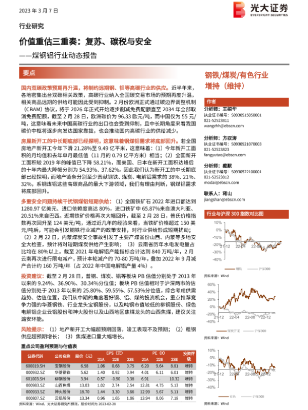 【光大证券】【20230307】煤钢铝行业动态报告:价值重估三重奏:复苏、碳税与安全-27页 行业研究