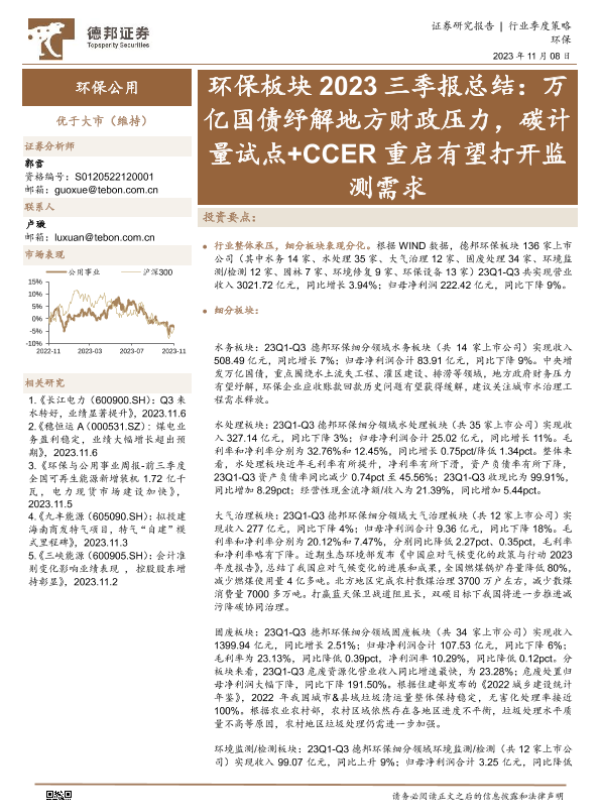 【德邦证券】【20231108】环保行业板块2023三季报总结:万亿国债纾解地方财政压力,碳计量试点+CCER重启有望打开监测需求-31页 行业研究
