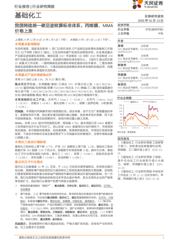 【天风证券】【20250113】20250113-天风证券-基础化工行业研究周报:我国将建统一碳足迹核算标准体系,丙烯腈、MMA价格上涨-20页 行业研究