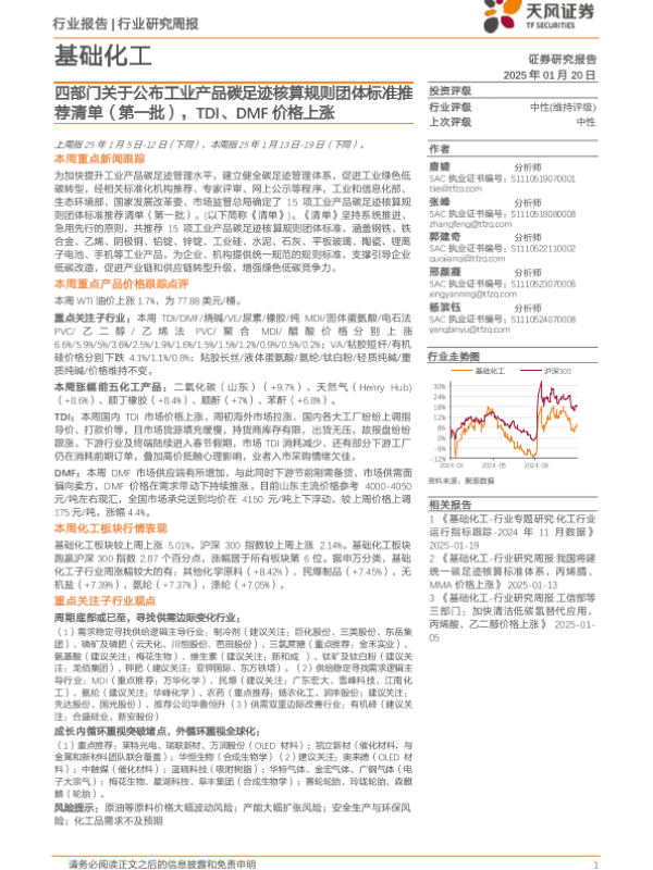 【天风证券】【20250120】基础化工行业研究周报:四部门关于公布工业产品碳足迹核算规则团体标准推荐清单(第一批),TDI、DMF价格上涨-20页 行业研究