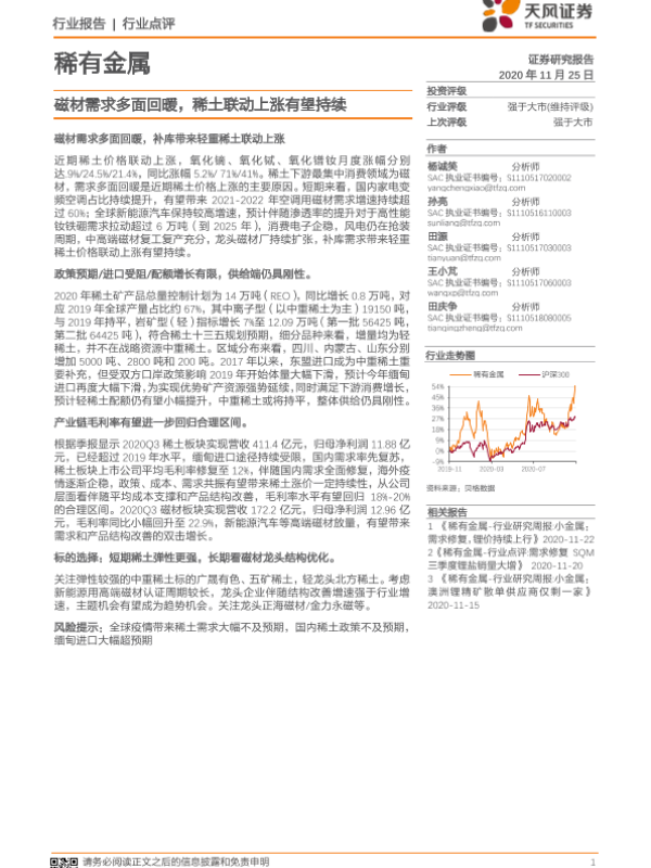 【天风证券】【20201125】稀有金属行业点评:磁材需求多面回暖,稀土联动上涨有望持续-2页 行业研究