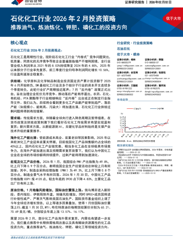 【国信证券】【202602】石化化工行业2026年2月投资策略:推荐油气、炼油炼化、钾肥、磷化工的投资方向-45页 证券期货研究报告