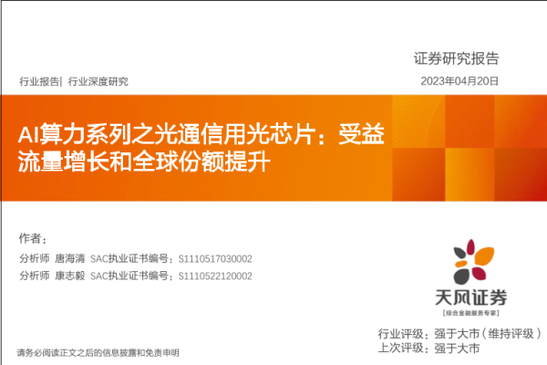 【天风证券】【20230420】AI算力系列之光通信用光芯片:受益流量增长和全球份额提升-31页 行业研究
