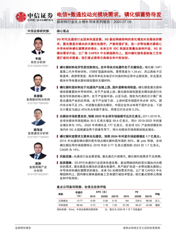 【中信证券】【20200709】20200709-中信证券-新材料行业化合物半导体系列报告:电信+数通拉动光模块需求,磷化铟蓄势待发-22页 行业研究
