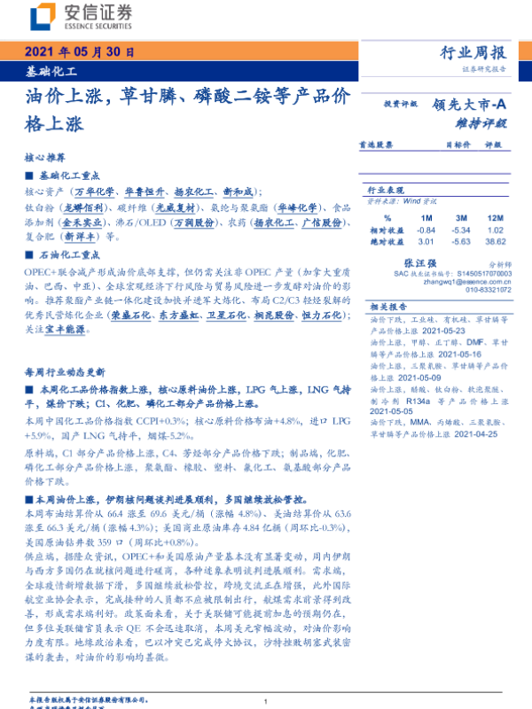 【安信证券】【20210530】基础化工行业周报:油价上涨,草甘膦、磷酸二铵等产品价格上涨-4页 行业研究