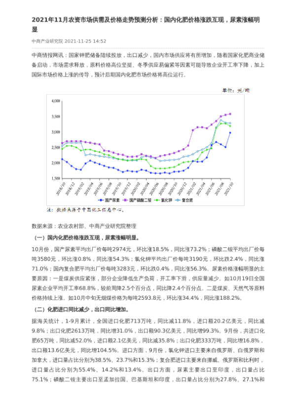 【中商产业研究院】【20211125】2021年11月农资市场供需及价格走势预测分析-2页 行业研究