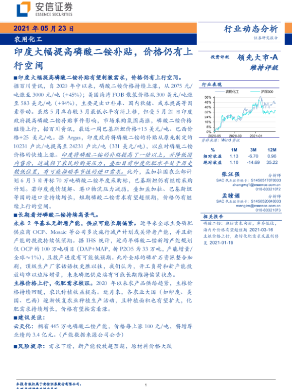 【安信证券】【20210523】农用化工行业动态分析:印度大幅提高磷酸二铵补贴,价格仍有上行空间-3页 行业研究