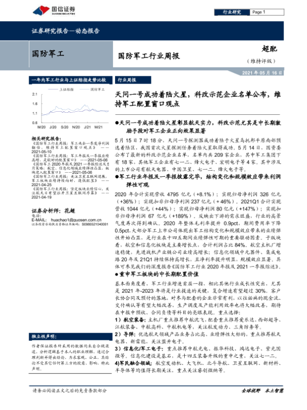 【国信证券】【20210516】国防军工行业周报:天问一号成功着陆火星,科改示范企业名单公布,维持军工配置窗口观点-14页 行业研究