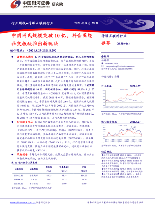 【银河证券】【20210829】中国银河-传媒互联网行业行业周报:中国网民规模突破10亿,抖音围绕行社交板块推出新玩法-36页 行业研究
