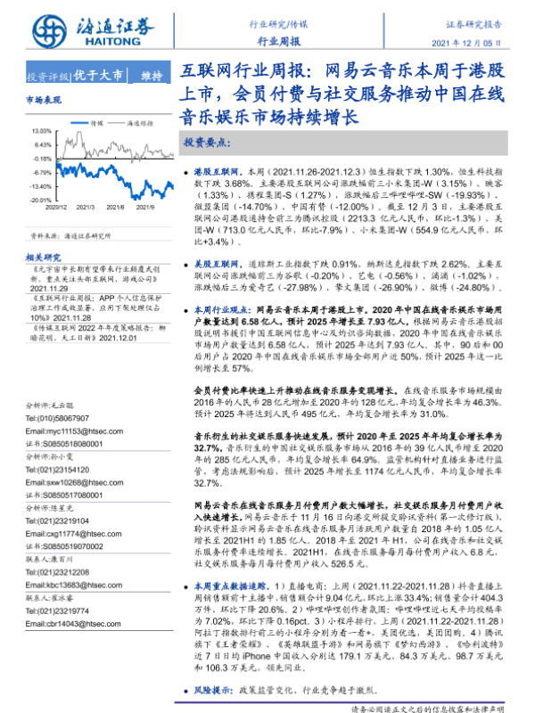 【海通证券】【20211205】20211205-海通证券-互联网行业周报:网易云音乐本周于港股上市,会员付费与社交服务推动中国在线音乐娱乐市场持续增长-10页 行业研究