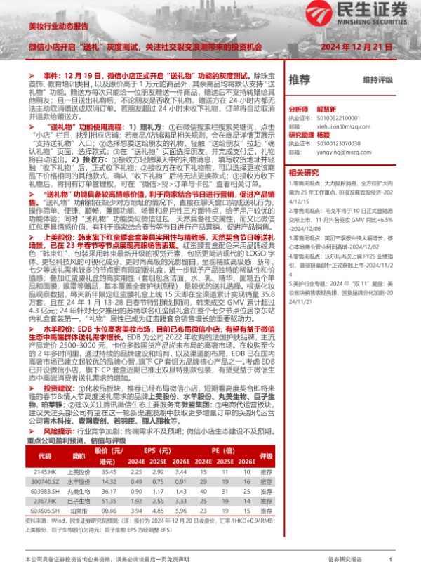【民生证券】【20241221】美妆行业动态报告:微信小店开启“送礼”灰度测试,关注社交裂变浪潮带来的投资机会-12页 行业研究