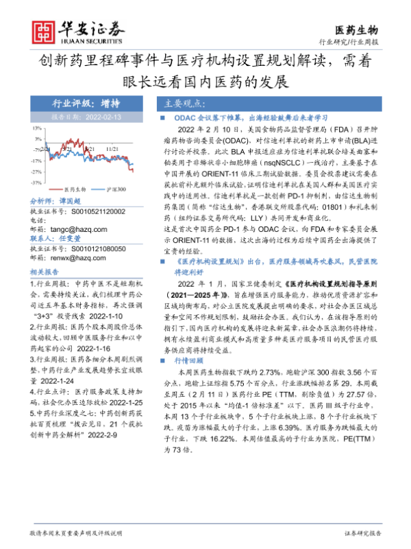 【华安证券】【20220213】医药生物行业周报:创新药里程碑事件与医疗机构设置规划解读-18页 行业研究