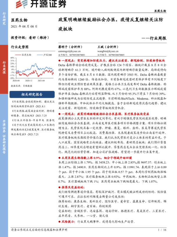 【开源证券】【20210808】医药生物行业周报:政策明确继续鼓励社会办医,疫情反复继续关注防疫板块-16页 行业研究