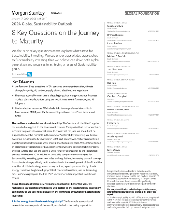 【Morgan Stanley】【20240101】2024全球可持续发展展望:关于成熟之旅的8个关键问题-42页 行业研究