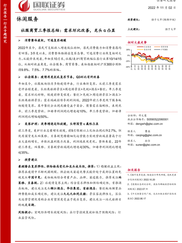 【国联证券】【20221102】社服商贸行业三季报总结:需求环比改善,龙头α凸显-23页 行业研究