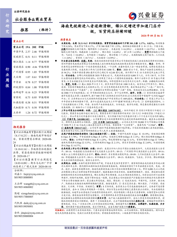 【兴业证券】【20200906】社会服务&商业贸易行业周报:海南免税新进入者逐渐清晰,锦江定增逆市加速门店升级,百货同店持续回暖-17页 行业研究