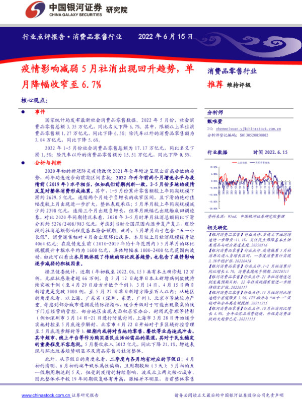 【银河证券】【20220615】疫情影响减弱5月社消出现回升趋势,单月降幅收窄至6.7%-6页 行业研究