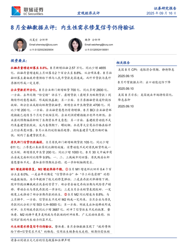 【联储证券】【202509】8月金融数据点评:内生性需求修复信号仍待验证-11页 证券期货研究报告
