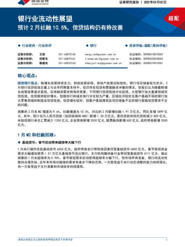 【国信证券】【20220302】银行业流动性展望:预计2月社融10.5%,信贷结构仍有待改善-6页 行业研究