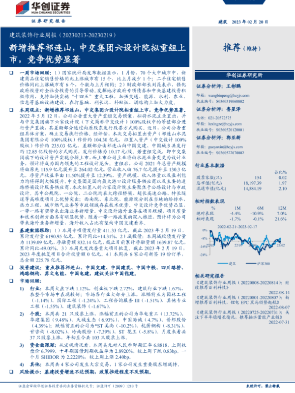 【华创证券】【20230220】建筑装饰行业周报:新增推荐祁连山,中交集团六设计院拟重组上市,竞争优势显著-16页 行业研究