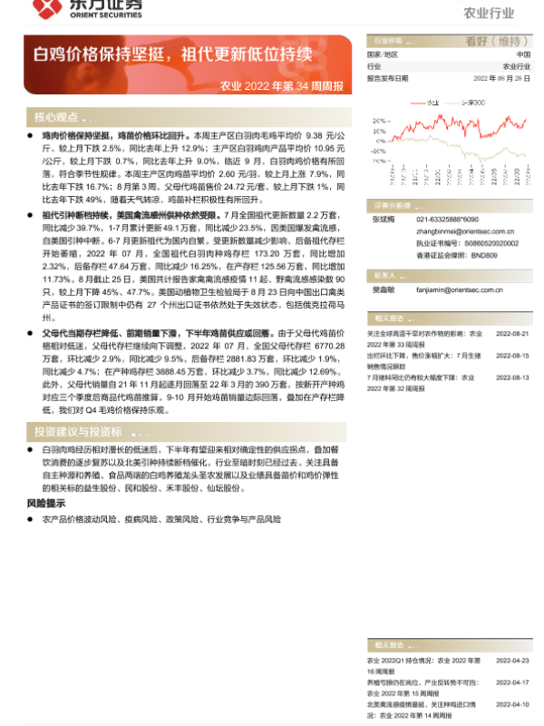 【东方证券】【20220828】农业2022年第34周周报:白鸡价格保持坚挺,祖代更新低位持续-8页 行业研究