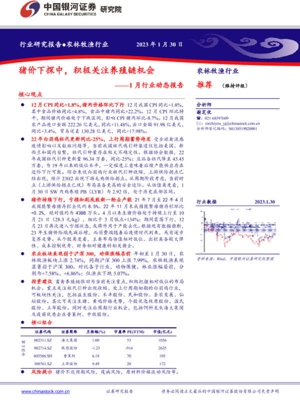 【银河证券】【20230130】20230130-中国银河-农林牧渔行业1月行业动态报告:猪价下探中,积极关注养殖链机会-22页 行业研究