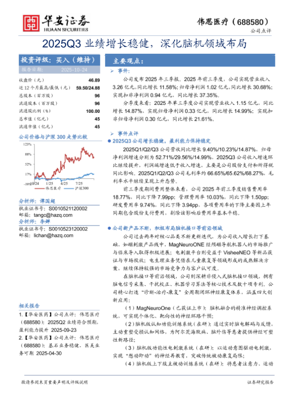 【华安证券】【202510】2025Q3业绩增长稳健,深化脑机领域布局-4页 证券期货研究报告