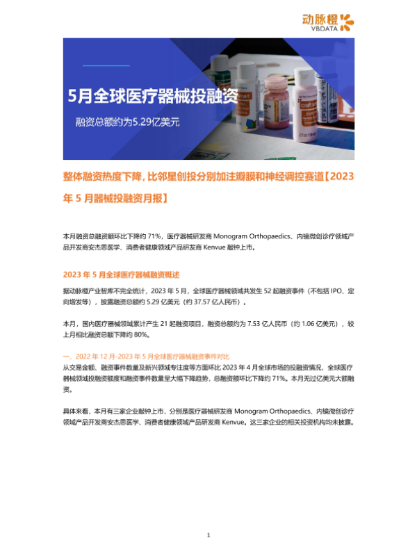 【动脉橙产业智库】【20230501】2023年5月器械投融资月报-6页 行业研究