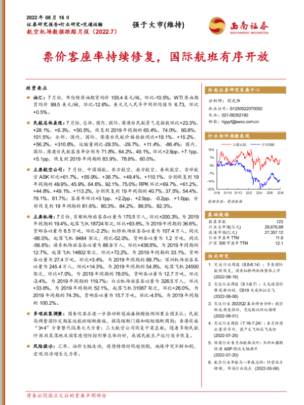 【西南证券】【20220816】航空机场数据跟踪月报:票价客座率持续修复,国际航班有序开放-17页 行业研究