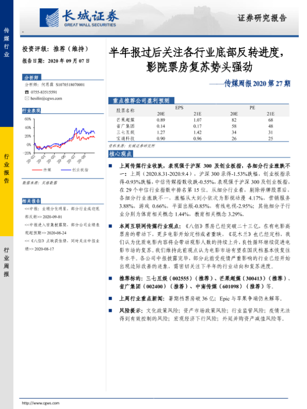 【长城证券】【20200907】传媒周报2020第27期:半年报过后关注各行业底部反转进度,影院票房复苏势头强劲-12页 行业研究