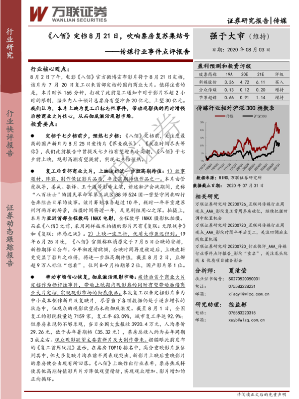 【万联证券】【20200803】20200803-万联证券-传媒行业事件点评报告:《八佰》定档8月21日,吹响票房复苏集结号-4页 行业研究