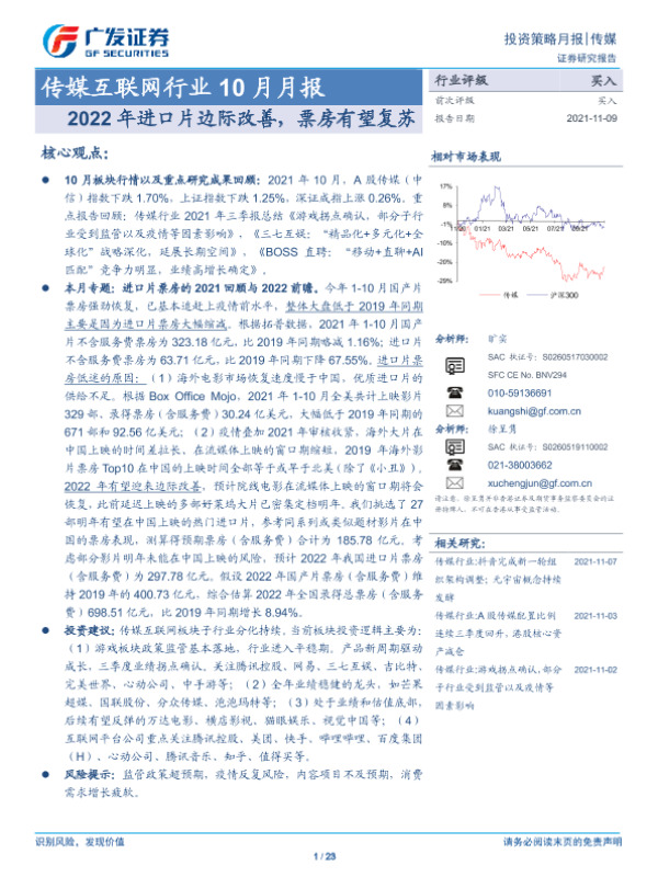 【广发证券】【20211109】20211109-广发证券-传媒互联网行业10月月报:2022年进口片边际改善,票房有望复苏-23页 行业研究