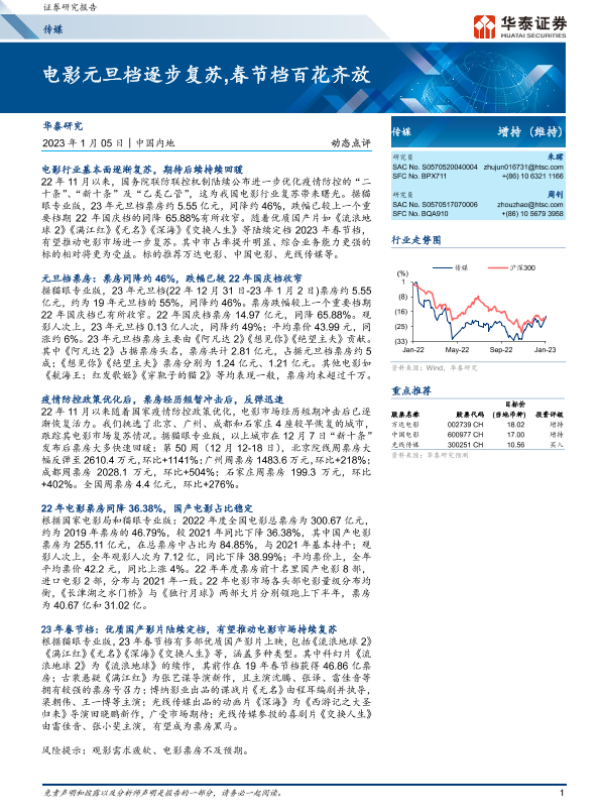 【华泰证券】【20230105】电影元旦档逐步复苏,春节档百花齐放-16页 行业研究