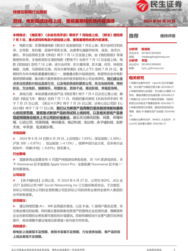 【民生证券】【20240630】传媒互联网行业周报:游戏、电影陆续定档上线,重视暑期档优质内容演绎-17页 行业研究