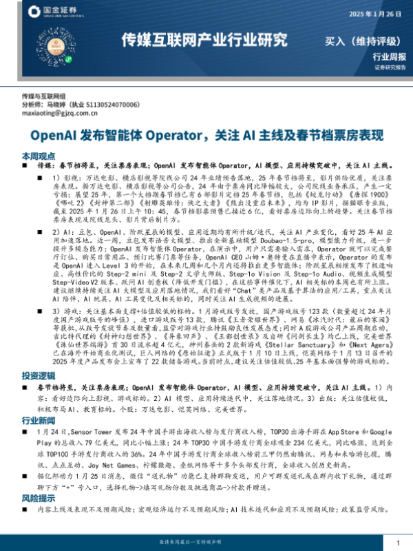 【国金证券】【20250126】传媒互联网产业行业周报:OpenAI发布智能体Operator,关注AI主线及春节档票房表现-11页 行业研究