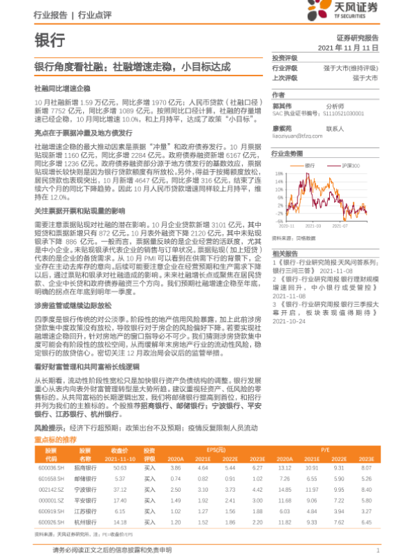 【天风证券】【20211111】银行角度看社融:社融增速走稳,小目标达成-4页 行业研究