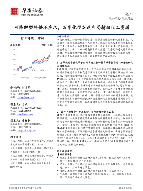 【华安证券】【20210123】20210123-华安证券-化工行业周报:可降解塑料供不应求,万华化学加速布局精细化工赛道-65页 行业研究