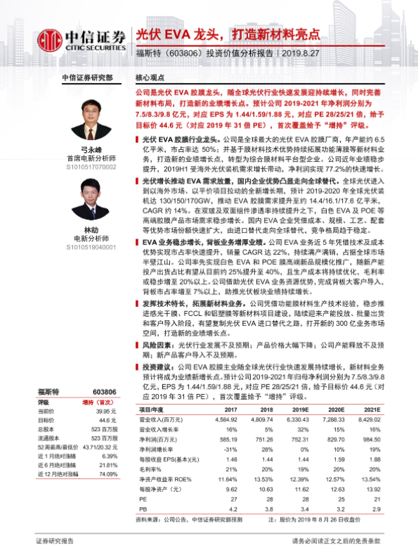 【中信证券】【20190827】20190827-中信证券-福斯特-603806.SH-投资价值分析报告:光伏EVA龙头,打造新材料亮点-31页 行业研究