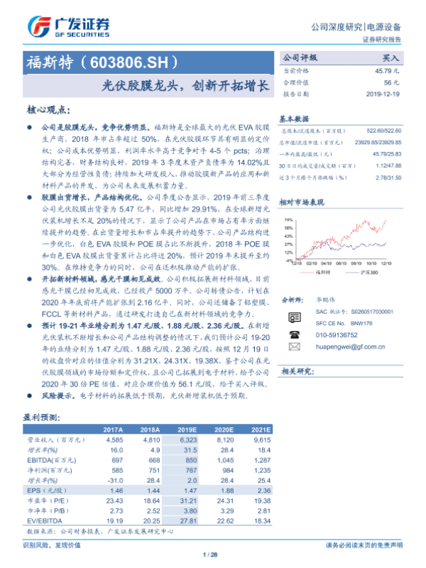 【广发证券】【20191219】福斯特(603806.SH):光伏胶膜龙头,创新开拓增长-28页 行业研究
