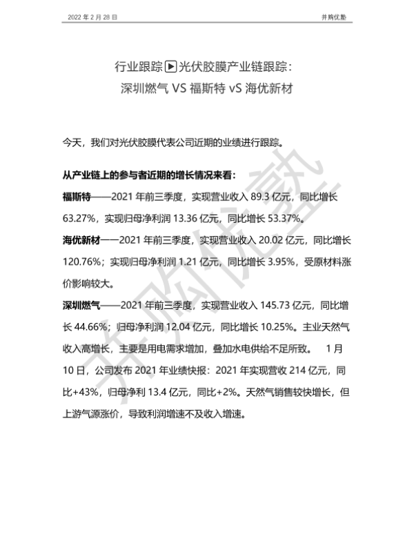 【并购优塾】【20220228】光伏胶膜产业链跟踪:深圳燃气VS福斯特vS海优新材-23页 行业研究