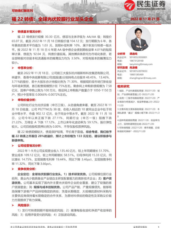【民生证券】【20221121】可转债打新系列:福22转债,全球光伏胶膜行业龙头企业-16页 行业研究