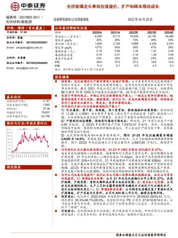 【中泰证券】【20220429】20220429-中泰证券-福莱特-601865.SH-光伏玻璃龙头享有估值溢价,扩产和降本推动成长-24页 行业研究
