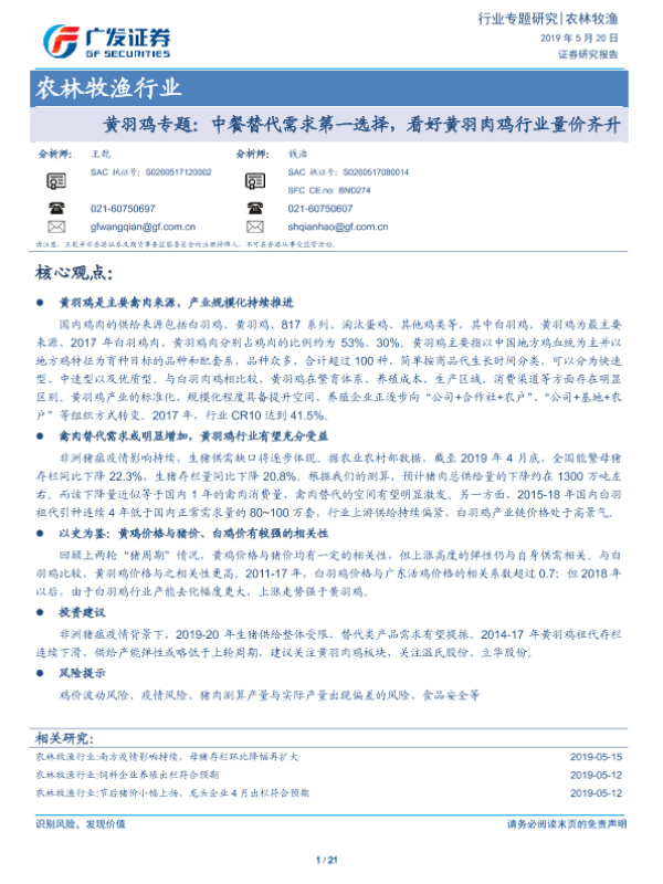 【广发证券】【20190520】农林牧渔行业:黄羽鸡专题:中餐替代需求第一选择,看好黄羽肉鸡行业量价齐升-21页 行业研究