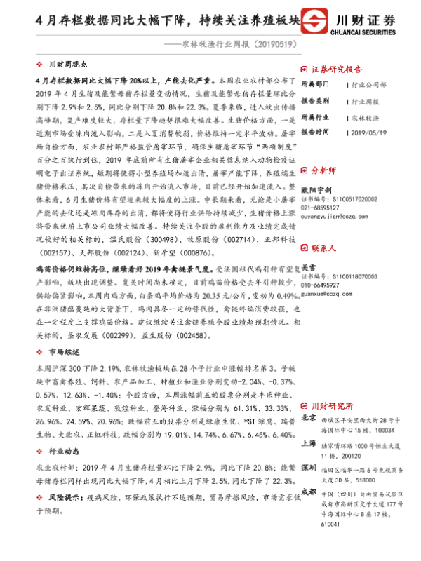 【川财证券】【20190519】20190519-川财证券-农林牧渔行业周报:4月存栏数据同比大幅下降,持续关注养殖板块-11页 行业研究