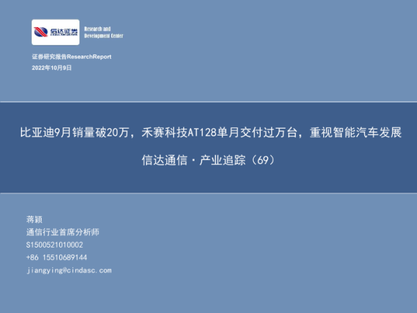 【信达证券】【20221009】信达证券-信达通信·产业追踪(69):比亚迪9月销量破20万,禾赛科技AT128单月交付过万台,重视智能汽车发展-23页 行业研究