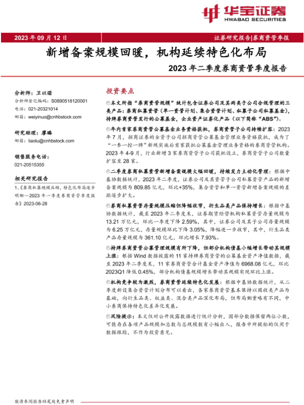 【华宝证券】【20230912】2023年二季度券商行业资管季度报告:新增备案规模回暖,机构延续特色化布局-17页 行业研究