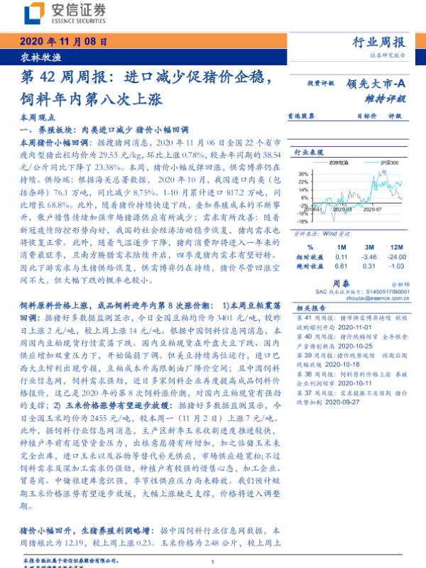 【安信证券】【20201108】农林牧渔第42周周报:进口减少促猪价企稳,饲料年内第八次上涨-19页 行业研究