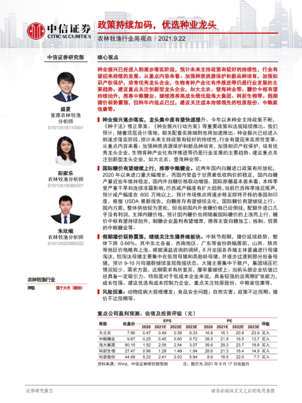 【中信证券】【20210922】20210922-中信证券-农林牧渔行业周观点:政策持续加码,优选种业龙头-7页 行业研究